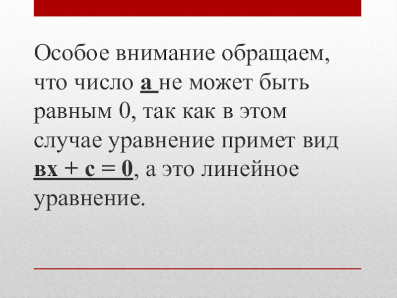 Особое внимание обращаем, что число а не может быть равным 0, так как в этом случае уравнение
