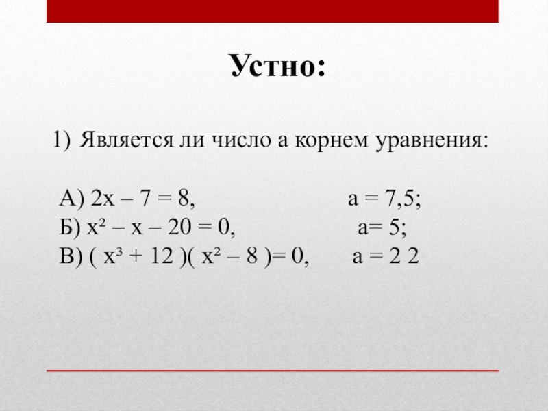 Устно: Является ли число а корнем уравнения:А) 2х – 7 = 8,