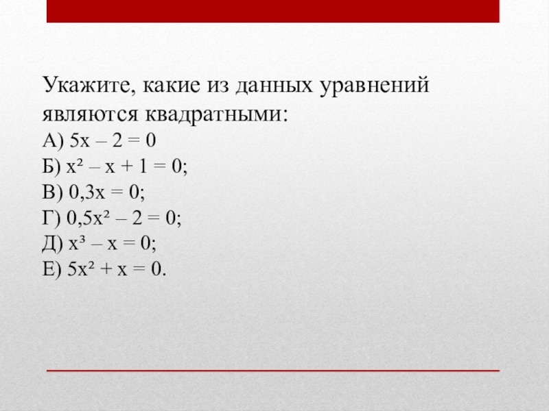 Слайд 9Укажите, какие из данных уравнений являются квадратными: