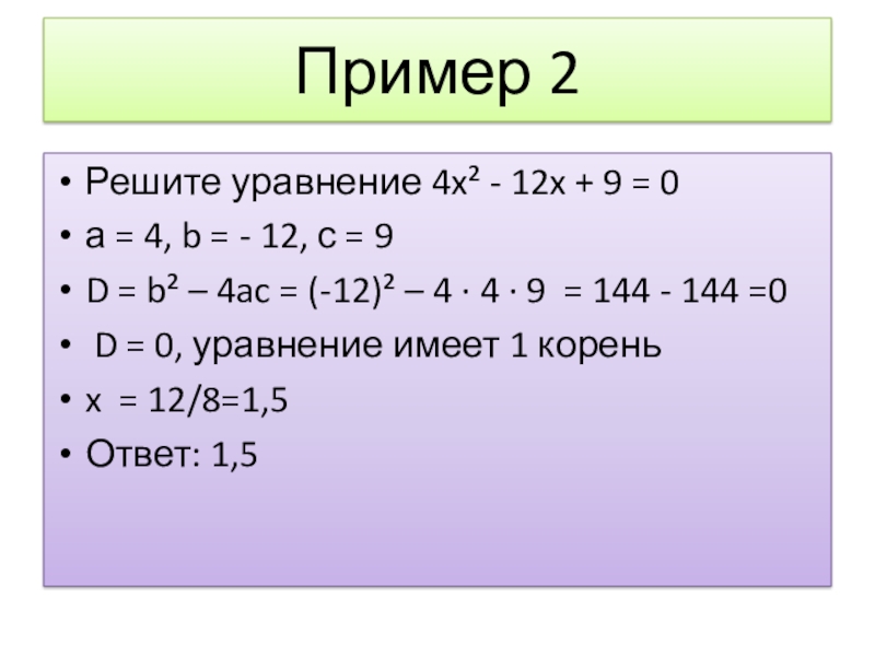 D = b² – 4ac = (-12)² – 4 ∙ 4 ∙ 9 = 144 - 144 =0