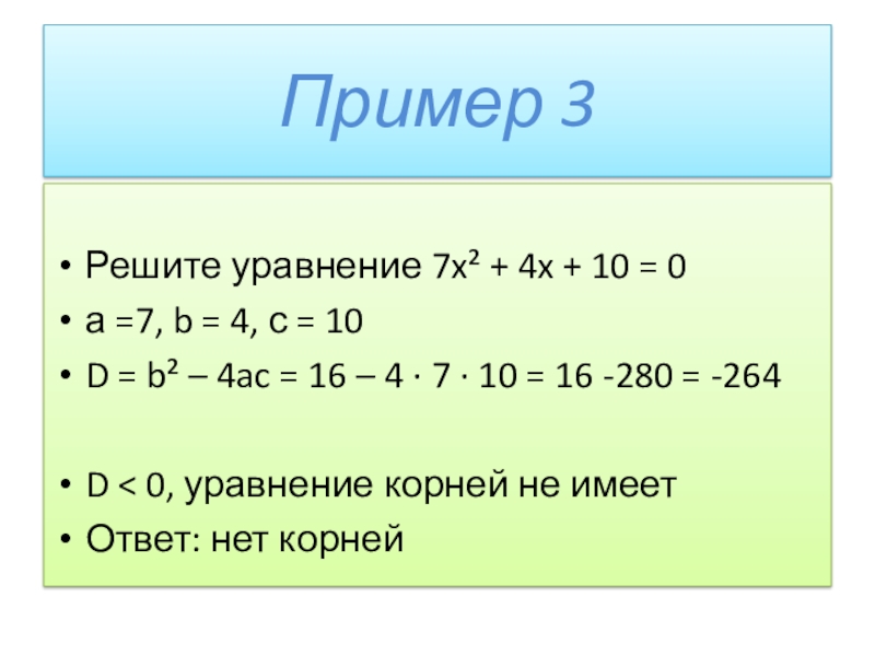 D = b² – 4ac = 16 – 4 ∙ 7 ∙ 10 = 16 -280 = -264