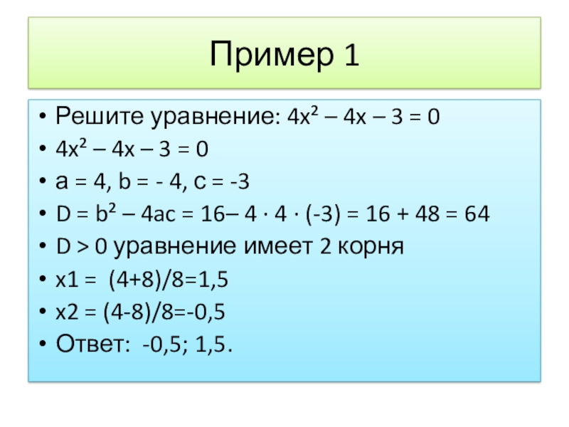 D = b² – 4ac = 16– 4 ∙ 4 ∙ (-3) = 16 + 48 = 64