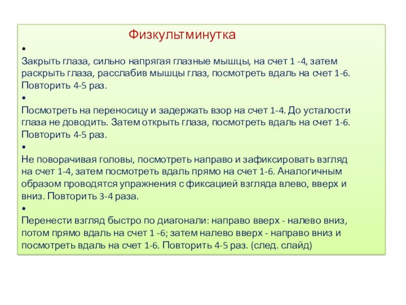посмотреть вдаль на счет 1-6. Повторить 4-5 раз. (след. слайд)