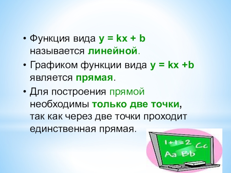 Функция вида у = kx + b называется линейной.Графиком функции вида у = kx +b является прямая.Для