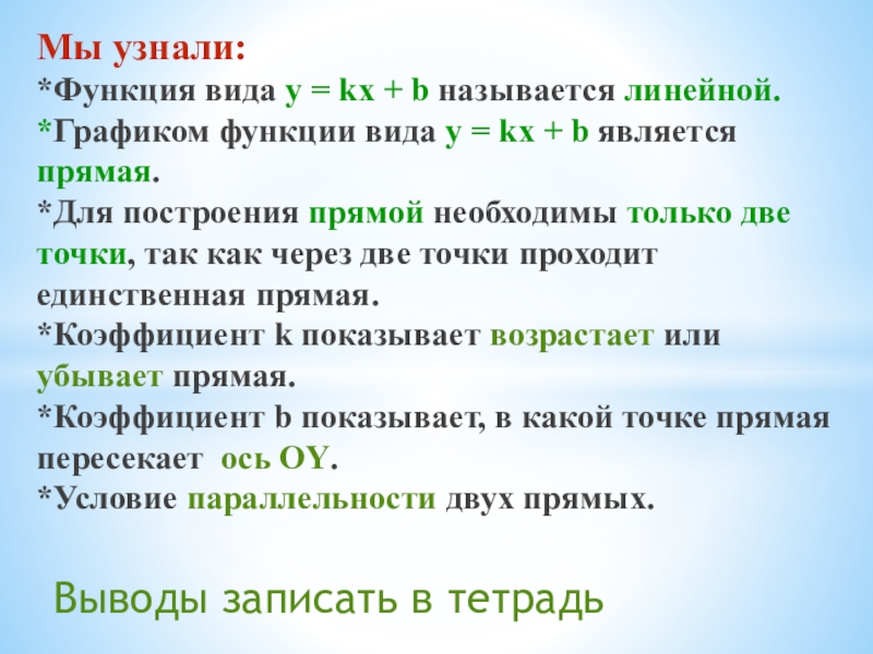 Выводы записать в тетрадьМы узнали: *Функция вида у = kx + b называется линейной. *Графиком функции вида