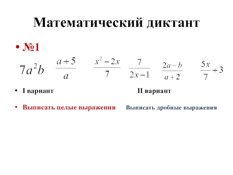 Презентация, доклад по алгебре математический диктант на тему Дробные рациональные выражения