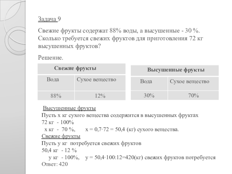 у кг - 100%, у = 50,4∙100:12=420(кг) свежих фруктов потребуется