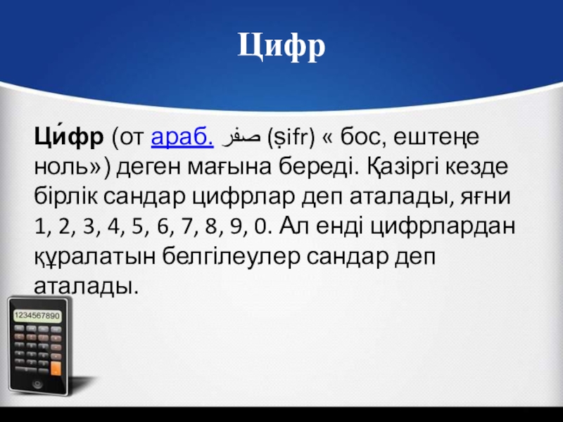 Ци́фр (от араб. صفر‎‎ (ṣifr) « бос, ештеңе ноль») деген мағына береді. Қазіргі кезде
