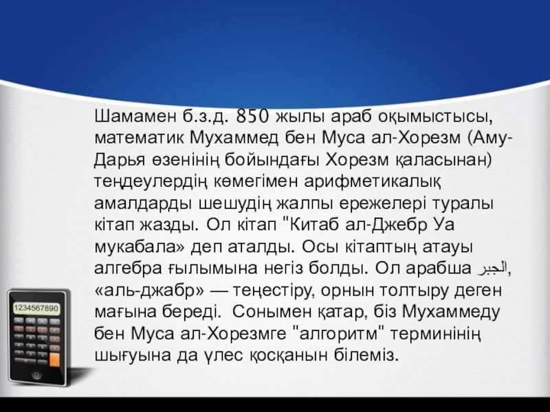 Слайд 2Шамамен б.з.д. 850 жылы араб оқымыстысы, математик Мухаммед бен Муса ал-Хорезм