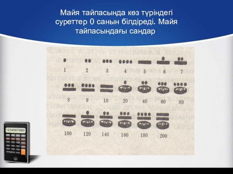 Слайд 4Майя тайпасында көз түріндегі суреттер 0 санын білдіреді. Майя тайпасындағы сандар:
