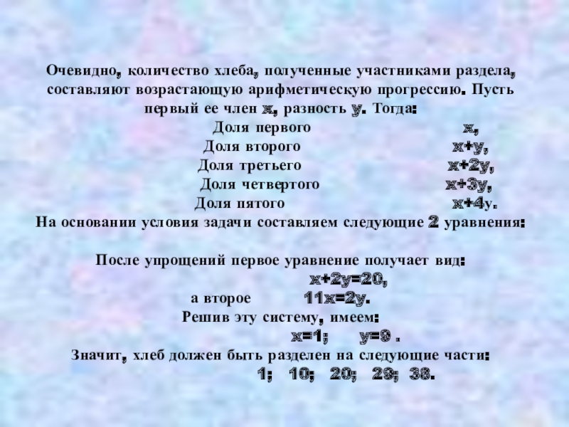Слайд 12Очевидно, количество хлеба, полученные участниками раздела, составляют возрастающую арифметическую прогрессию. Пусть