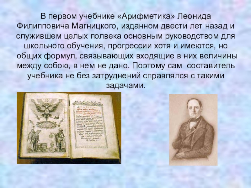 и служившем целых полвека основным руководством для школьного обучения, прогрессии хотя и имеются, но общих формул, связывающих входящие в них величины между собою, в нем не дано. Поэтому сам составитель учебника не без затруднений справлялся с такими задачами.