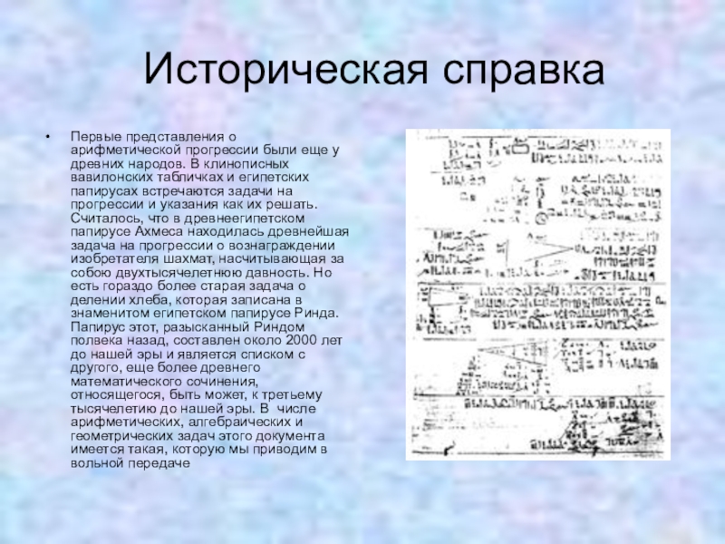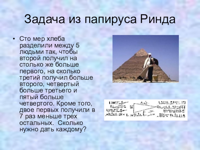 древних народов. В клинописных вавилонских табличках и египетских папирусах встречаются задачи на прогрессии и указания как их решать. Считалось, что в древнеегипетском папирусе Ахмеса находилась древнейшая задача на прогрессии о вознаграждении изобретателя шахмат, насчитывающая за собою двухтысячелетнюю давность. Но есть гораздо более старая задача о делении хлеба, которая записана в знаменитом египетском папирусе Ринда. Папирус этот, разысканный Риндом полвека назад, составлен около 2000 лет до нашей эры и является списком с другого, еще более древнего математического сочинения, относящегося, быть может, к третьему тысячелетию до нашей эры. В числе арифметических, алгебраических и геометрических задач этого документа имеется такая, которую мы приводим в вольной передаче