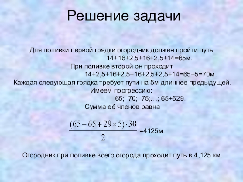 Каждая следующая грядка требует пути на 5м длиннее предыдущей. Имеем прогрессию: