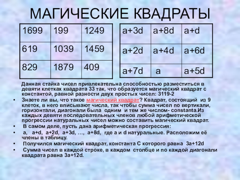 Знаете ли вы, что такое магический квадрат? Квадрат, состоящий из 9 клеток, в него вписывают числа, так чтобы сумма чисел по вертикали, горизонтали, диагонали была одним и тем же числом- constanta.Из каждых девяти последовательных членов любой арифметической прогрессии натуральных чисел можно составить магический квадрат.