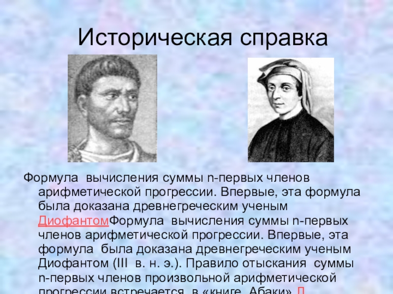 эта формула была доказана древнегреческим ученым ДиофантомФормула вычисления суммы n-первых членов арифметической прогрессии. Впервые, эта формула была доказана древнегреческим ученым Диофантом (III в. н. э.). Правило отыскания суммы n-первых членов произвольной арифметической прогрессии встречается в «книге Абаки» Л. Фибоначчи (1202г.).
