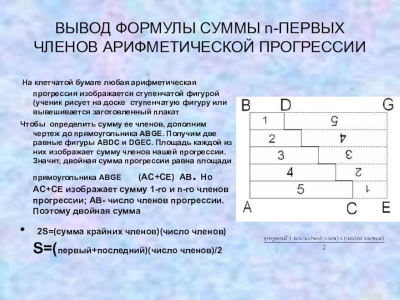 Чтобы определить сумму ее членов, дополним чертеж до прямоугольника ABGE. Получим две равные фигуры ABDC и DGEC. Площадь каждой из них изображает сумму членов нашей прогрессии. Значит, двойная сумма прогрессии равна площади прямоугольника ABGE (AC+CE) AB. Но AC+CE изображает сумму 1-го и n-го членов прогрессии; AB- число членов прогрессии. Поэтому двойная сумма