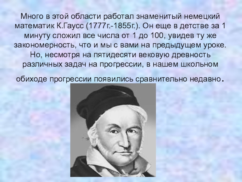 еще в детстве за 1 минуту сложил все числа от 1 до 100, увидев ту же закономерность, что и мы с вами на предыдущем уроке. Но, несмотря на пятидесяти вековую древность различных задач на прогрессии, в нашем школьном обиходе прогрессии появились сравнительно недавно.