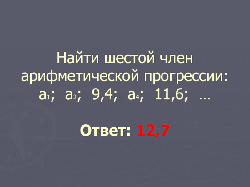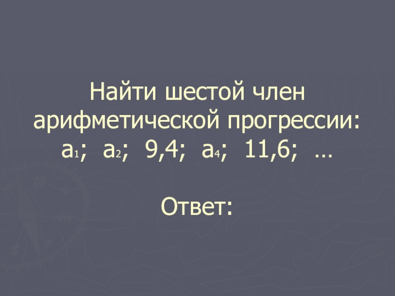 Слайд 11Найти шестой член арифметической прогрессии: а1; а2; 9,4; а4; 11,6; … Ответ: