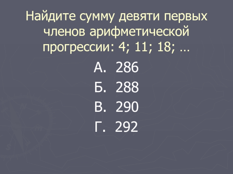 Найдите сумму девяти первых членов арифметической прогрессии: 4; 11; 18; …А. 286Б. 288В. 290Г. 292