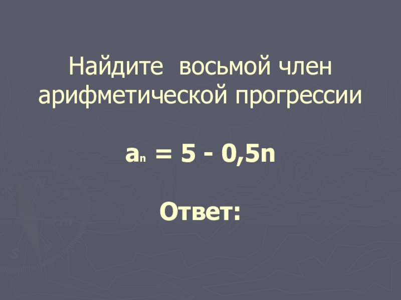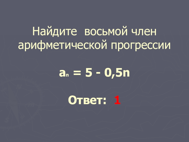 Слайд 7Найдите восьмой член арифметической прогрессии аn = 5 - 0,5n Ответ:
