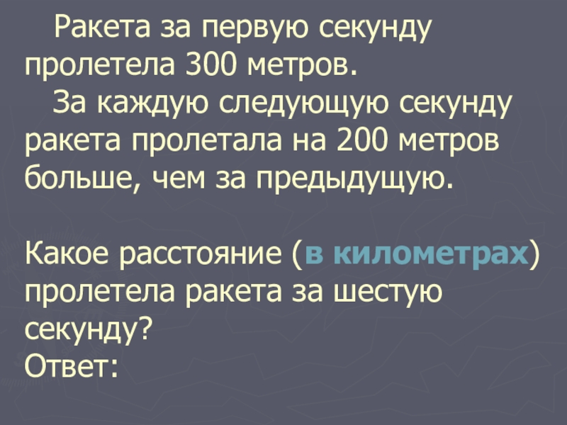 Слайд 16 Ракета за первую секунду пролетела 300 метров. За