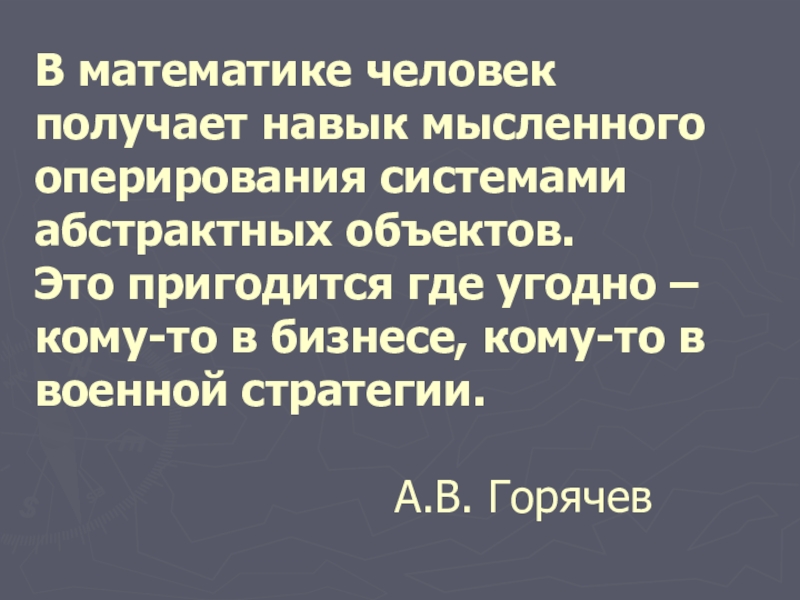 Слайд 20В математике человек получает навык мысленного оперирования системами абстрактных объектов. Это пригодится