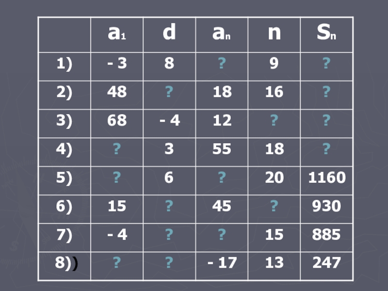 Слайд 13Найдите сумму девяти первых членов арифметической прогрессии: 4; 11; 18; …