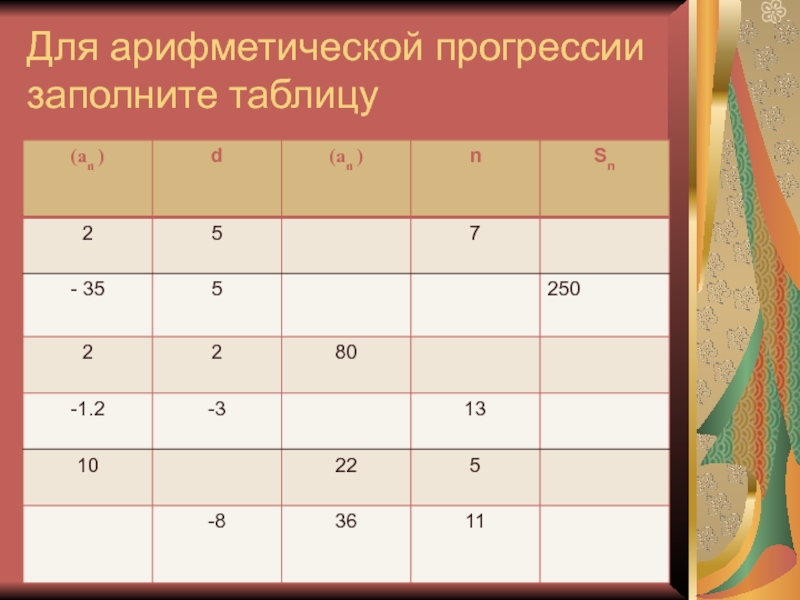 Слайд 8Для арифметической прогрессии заполните таблицу