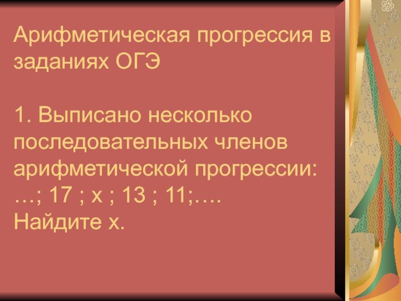 Слайд 11 Арифметическая прогрессия в заданиях ОГЭ 1. Выписано несколько последовательных членов арифметической прогрессии: …;