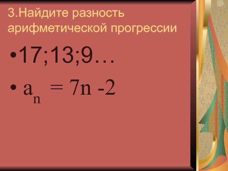 3.Найдите разность арифметической прогрессии17;13;9… аn = 7n -2