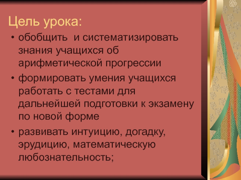 Цель урока:обобщить и систематизировать знания учащихся об арифметической прогрессииформировать умения учащихся работать с тестами для дальнейшей подготовки