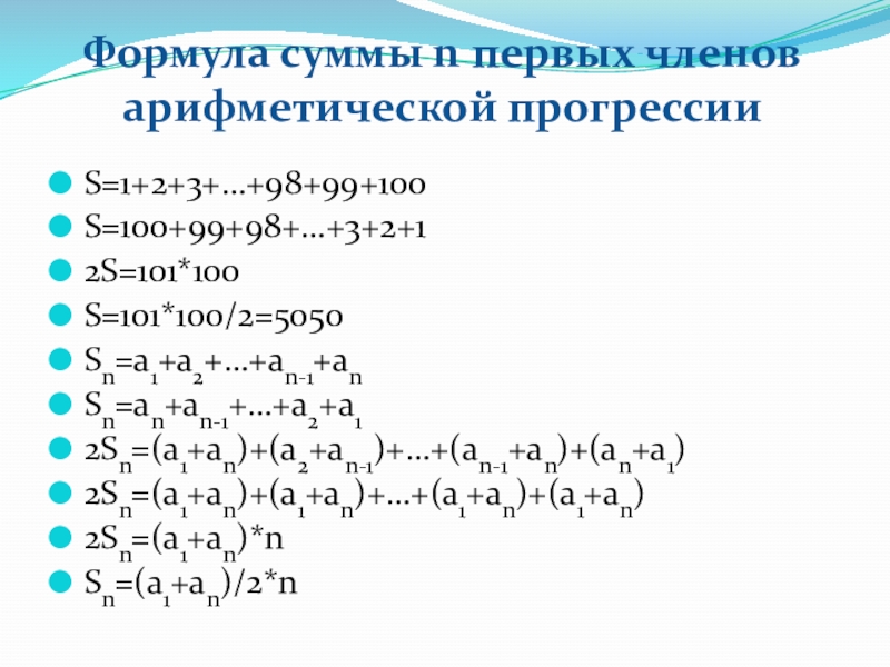 2Sn=(а1+аn)+(а2+аn-1)+…+(аn-1+аn)+(аn+а1)