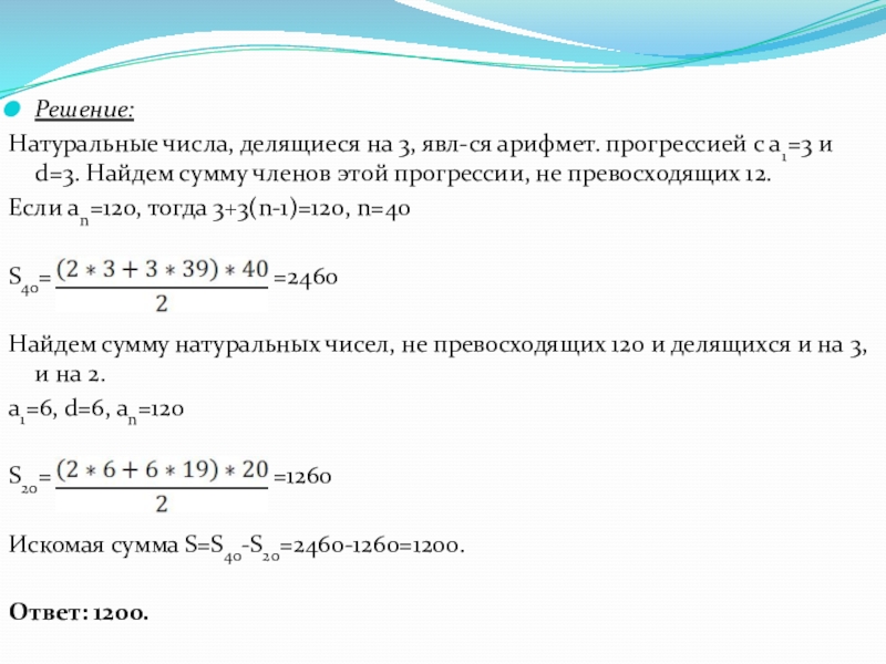 Найдите сумму всех натуральных чисел, не превосходящих 120, которые делятся