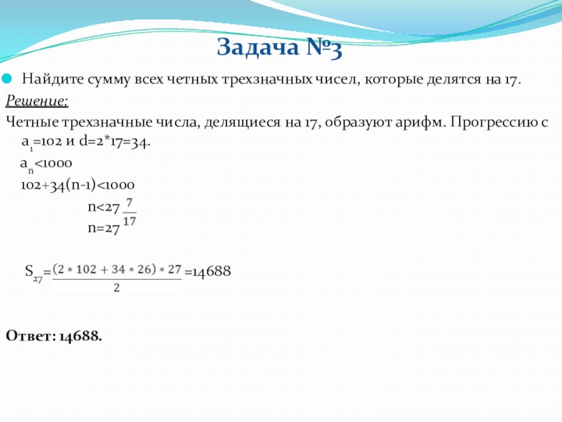 Натуральные числа, делящиеся на 3, явл-ся арифмет. прогрессией с a1=3 и