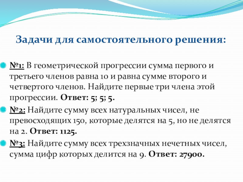 членов равна 10 и равна сумме второго и четвертого членов. Найдите первые три члена этой прогрессии. Ответ: 5; 5; 5.
