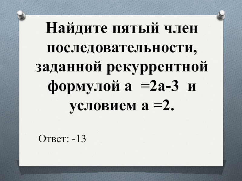 Слайд 7Найдите пятый член последовательности, заданной рекуррентной формулой a =2a-3 и условием