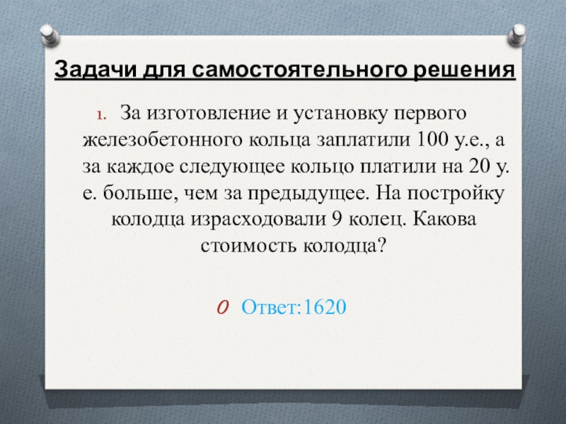 100 у.е., а за каждое следующее кольцо платили на 20 у.е. больше, чем за предыдущее. На постройку колодца израсходовали 9 колец. Какова стоимость колодца?