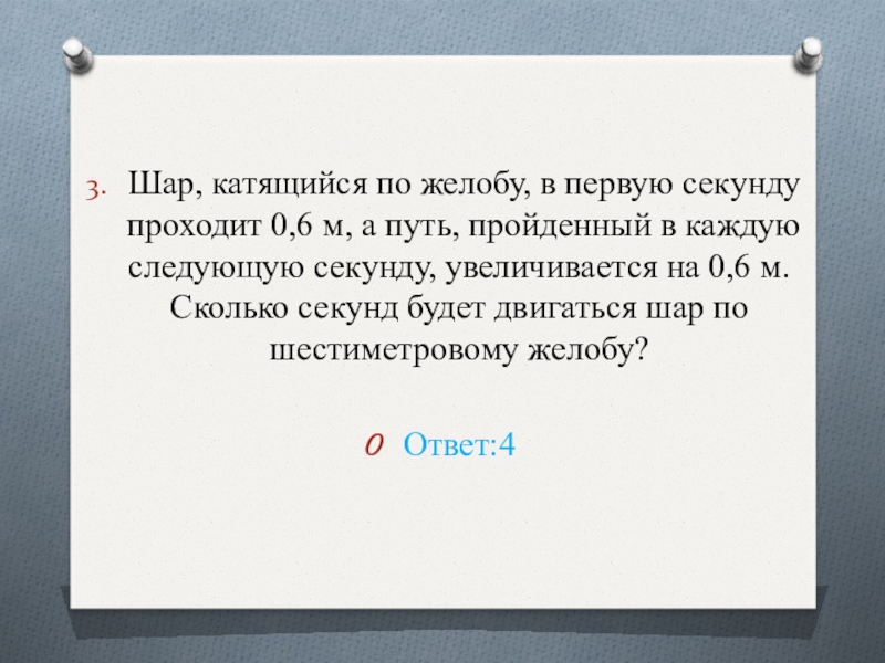 путь, пройденный в каждую следующую секунду, увеличивается на 0,6 м. Сколько секунд будет двигаться шар по шестиметровому желобу?