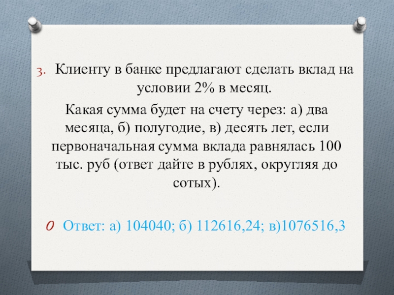 Слайд 30Клиенту в банке предлагают сделать вклад на условии 2% в месяц.