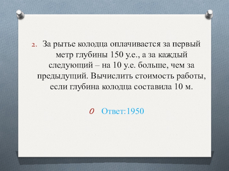 Слайд 18За рытье колодца оплачивается за первый метр глубины 150 у.е., а