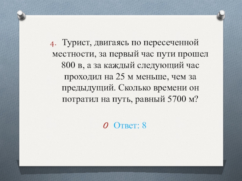 Слайд 20Турист, двигаясь по пересеченной местности, за первый час пути прошел 800