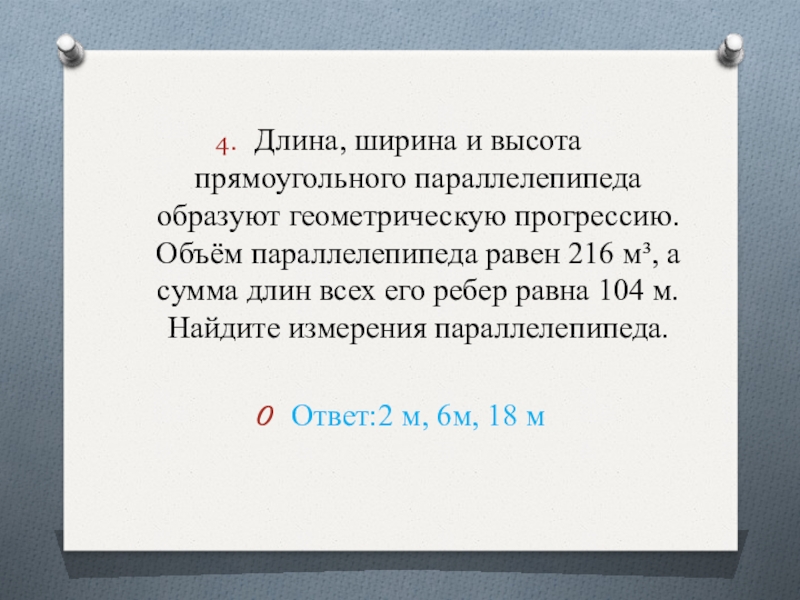 Слайд 31Длина, ширина и высота прямоугольного параллелепипеда образуют геометрическую прогрессию. Объём параллелепипеда