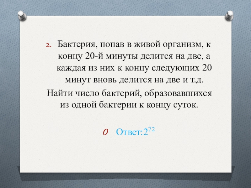 Слайд 29Бактерия, попав в живой организм, к концу 20-й минуты делится на