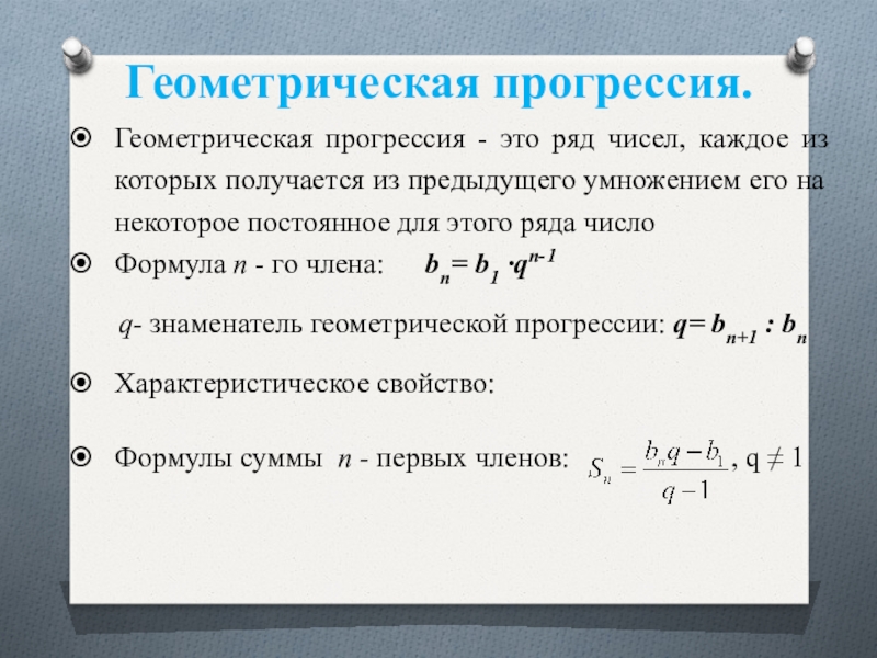 Формулы суммы п - первых членов: , q ≠ 1