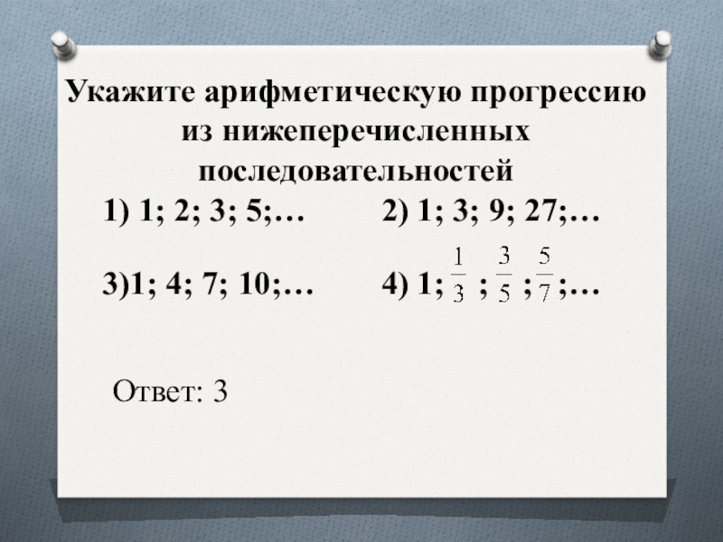 Слайд 11Укажите арифметическую прогрессию из нижеперечисленных последовательностей
