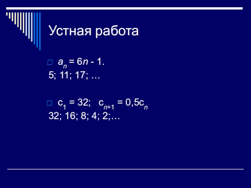 Устная работааn = 6n - 1.5; 11; 17; …с1 = 32; 	сn+1 = 0,5сn32; 16; 8; 4;