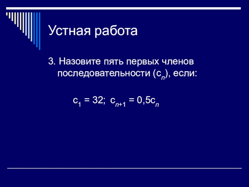 Устная работа3. Назовите пять первых членов последовательности (сn), если:		с1 = 32; 	сn+1 = 0,5сn
