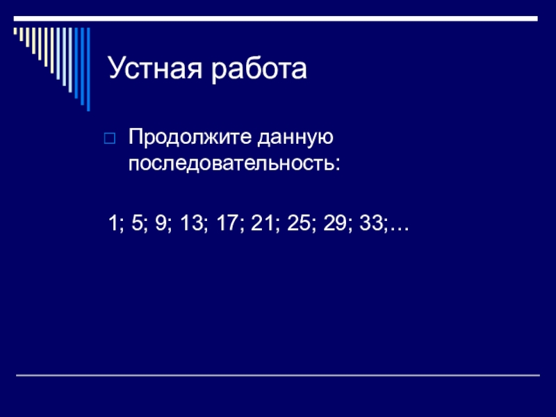 Устная работаПродолжите данную последовательность:1; 5; 9; 13; 17; 21; 25; 29; 33;…
