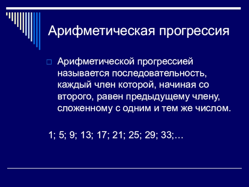 Арифметическая прогрессия1; 5; 9; 13; 17; 21; 25; 29; 33;…